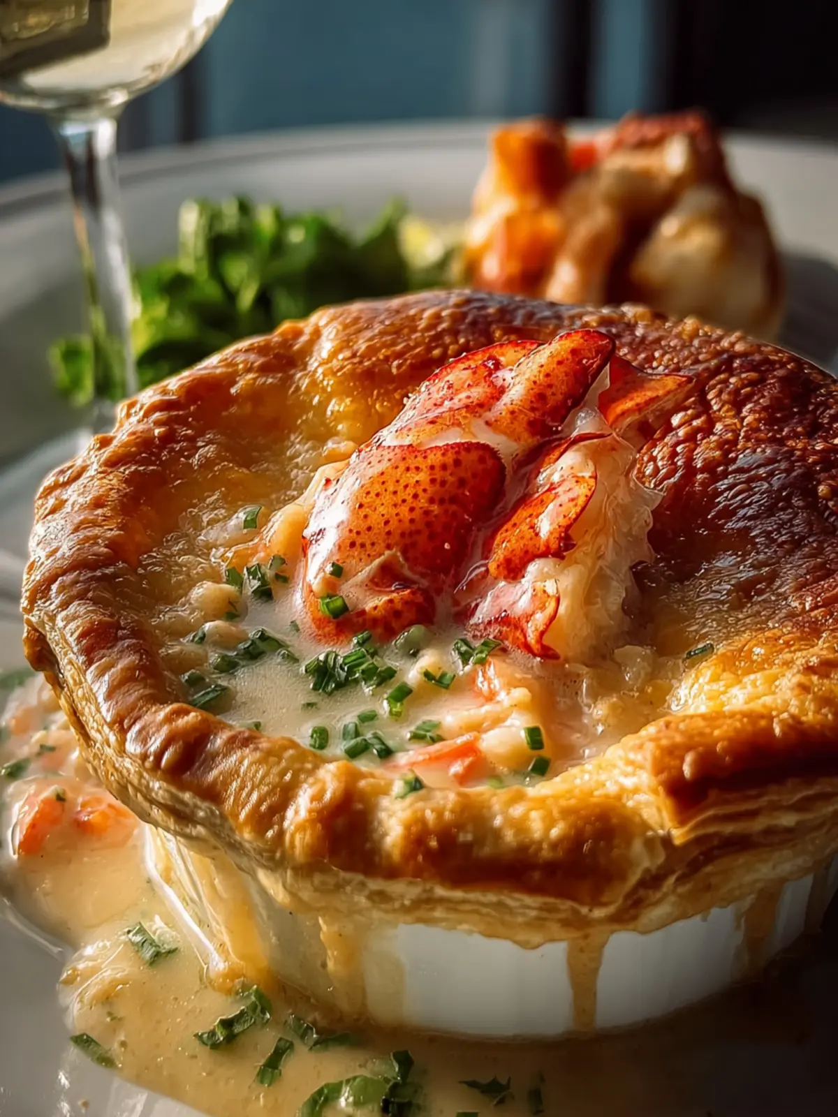 A creamy lobster pot pie topped with golden puff pastry.