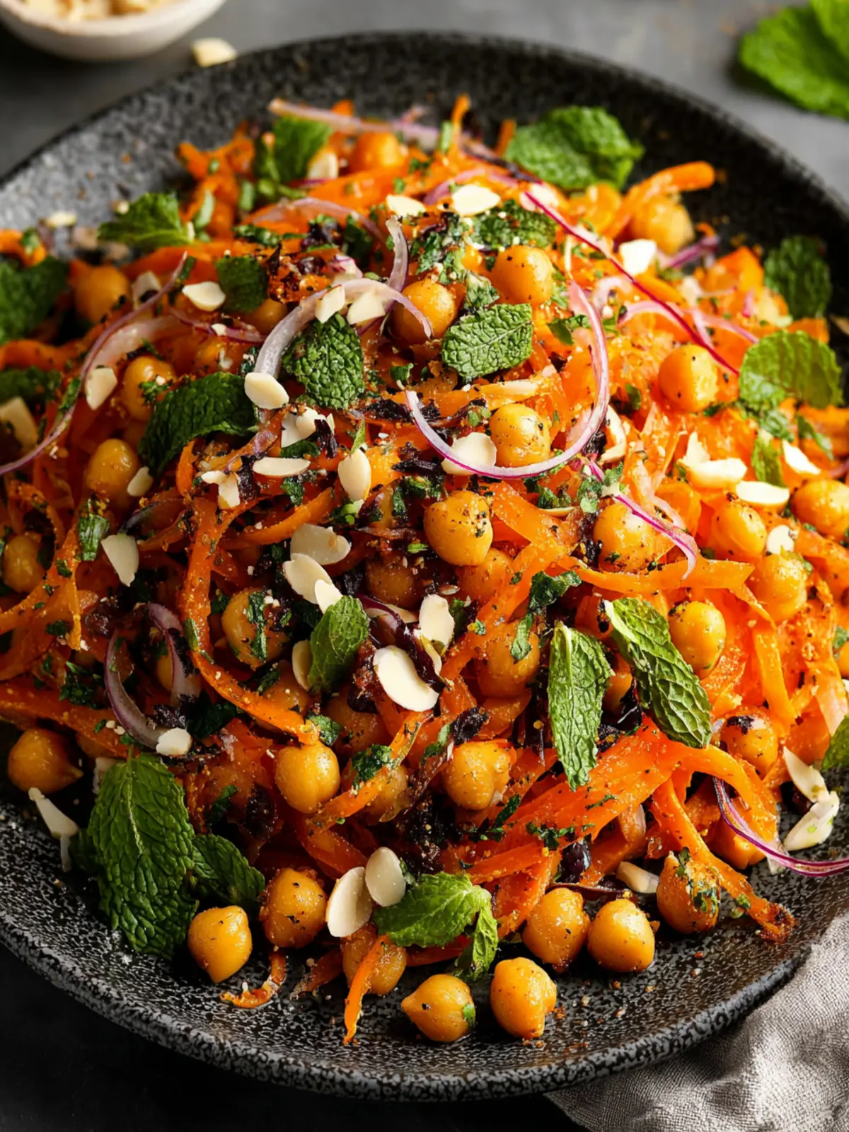 In summary, the Moroccan carrot and chickpea salad is a vibrant dish that brings together an array of flavors and textures, making it a delightful addition to any meal. Its combination of fresh ingredients, including crisp carrots and hearty chickpeas, is not only nutritious but also incredibly satisfying. Whether enjoyed as a light lunch or a side dish at dinner, this salad is versatile and easy to customize. Don’t hesitate to experiment with spices or add your favorite toppings to make it your own! With this recipe, you’re sure to impress your taste buds and those of your loved ones. Embrace this culinary adventure; the flavors of Morocco await!